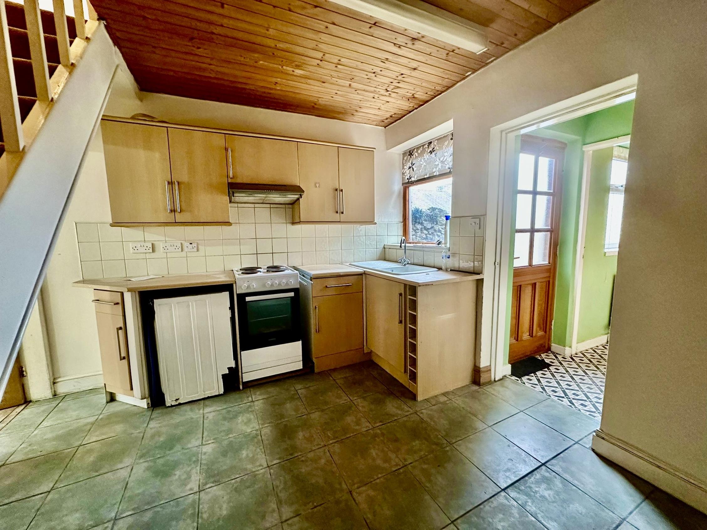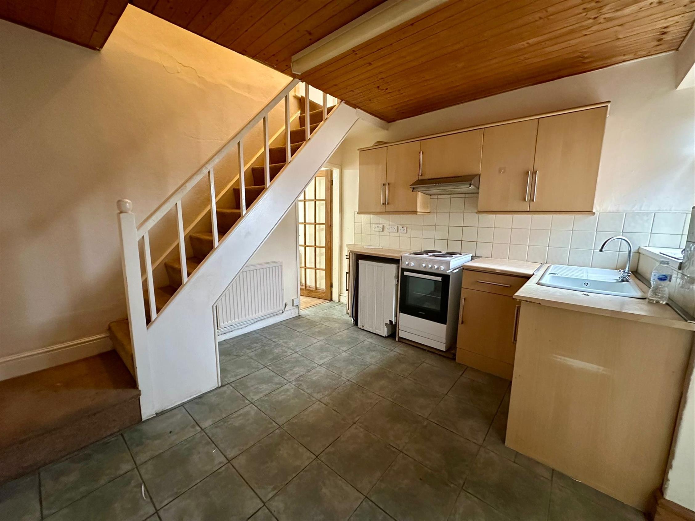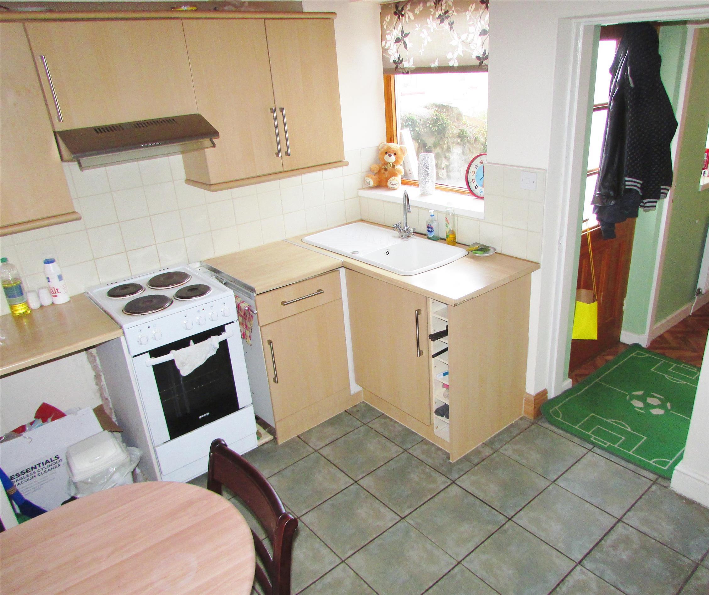 The kitchen to the rear has a good range of units finished in light beech with stainless steel trim with inset electric oven. There is a rear annex area with storage and plumbed for washing machine. A new downstairs bathroom with three piece suite and over bath shower. Stairs lead up from the kitchen to the first floor were there are two double bedrooms. The property has neutral decor and floor covering through out.