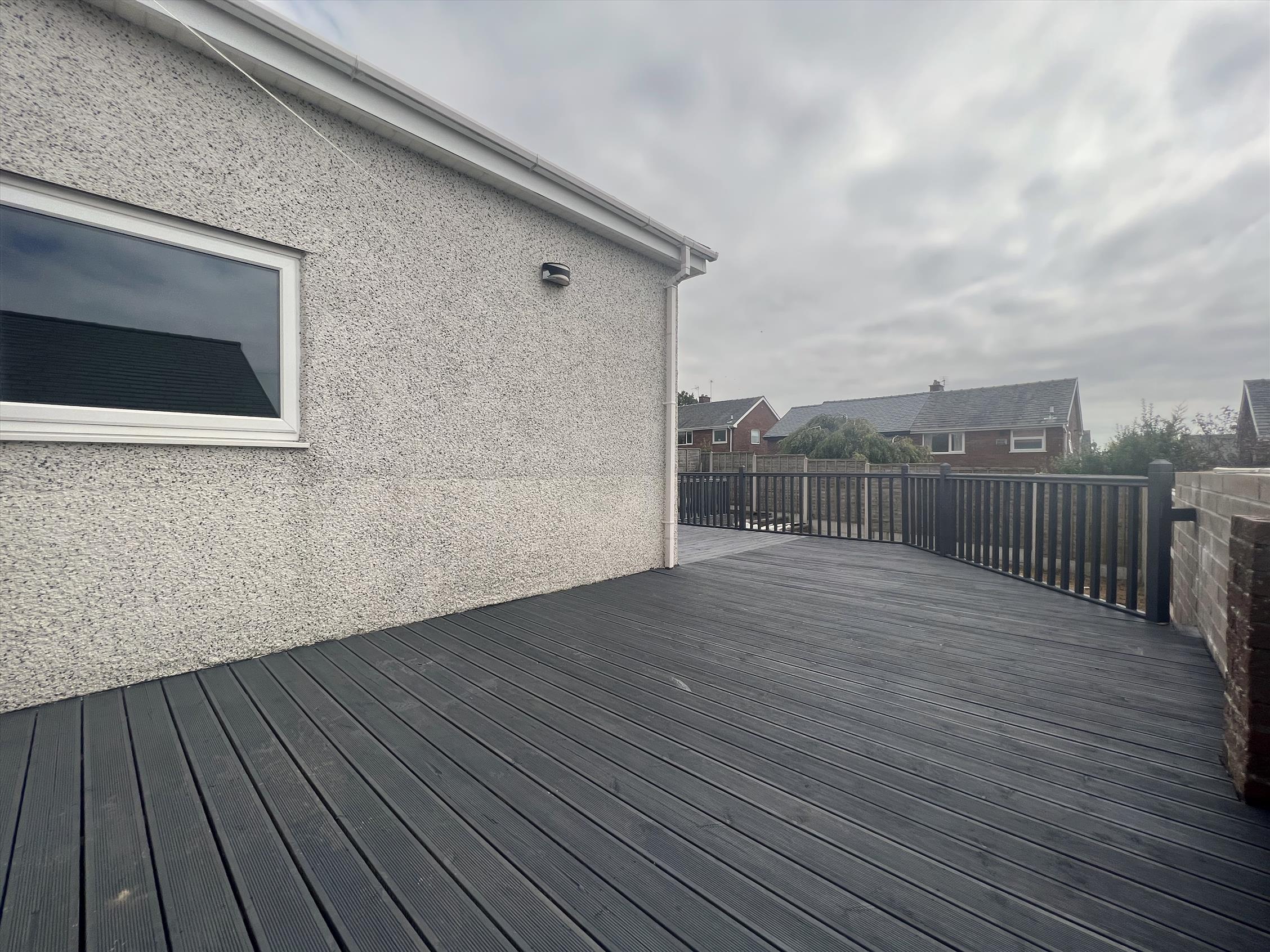 Externally, the property boasts a generous split-level garden with wraparound decking and a lawned area, ideal for outdoor enjoyment. To the front, there is a further lawned garden, along with a block-paved double driveway and a garage accessed via UPVC doors.