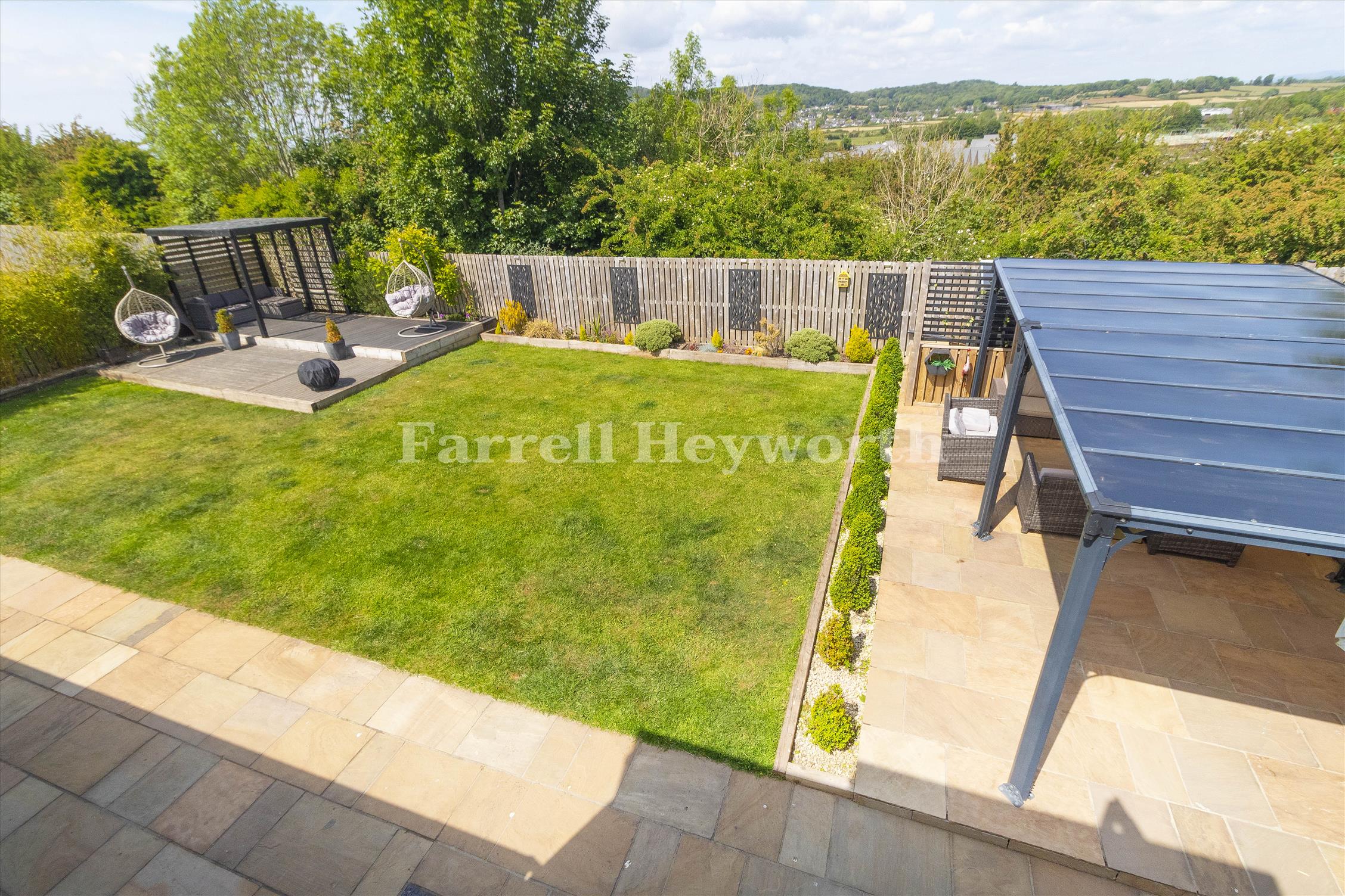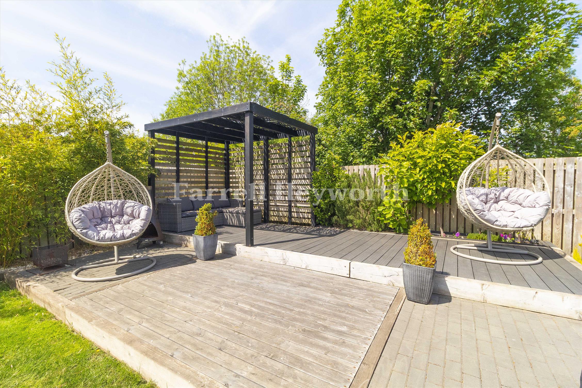 Outside, the rear garden has been carefully designed for entertaining, relaxation, and play. A paved outdoor entertaining area features two stylish pergolas, offering ideal spaces for alfresco dining or lounging. A dedicated astro-turfed play area provides an all-weather surface for children, and the garden also benefits from two storage sheds and three external power supplies.