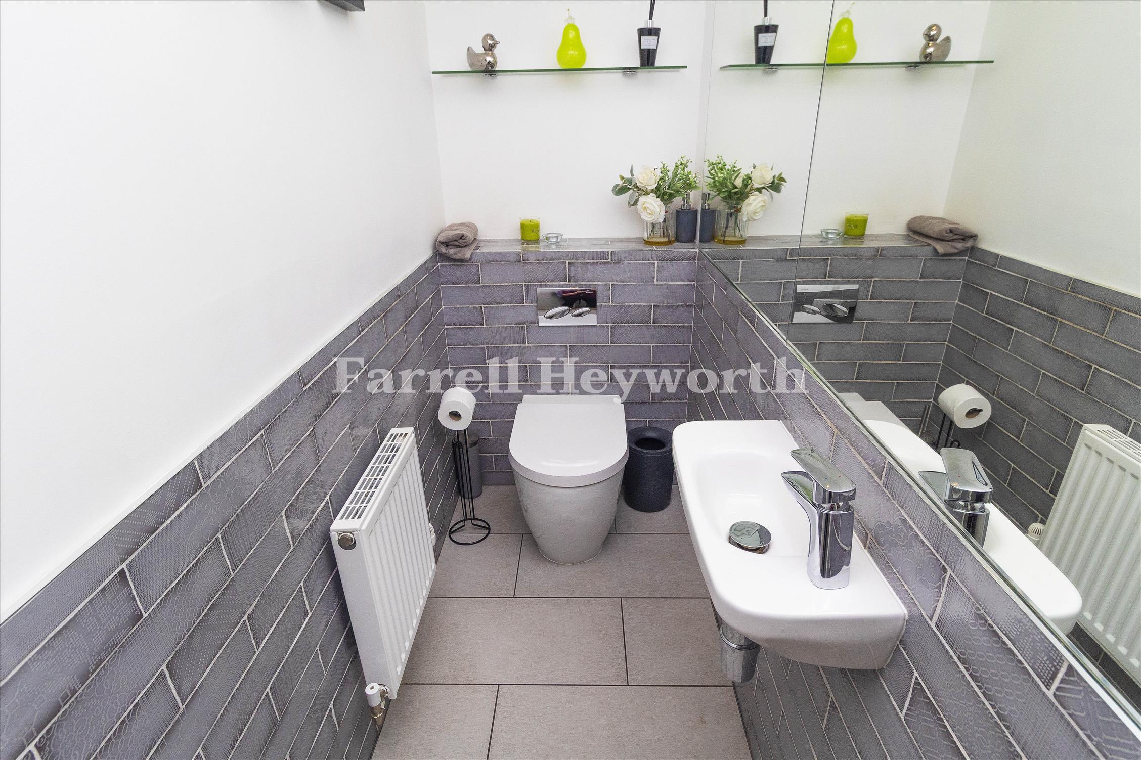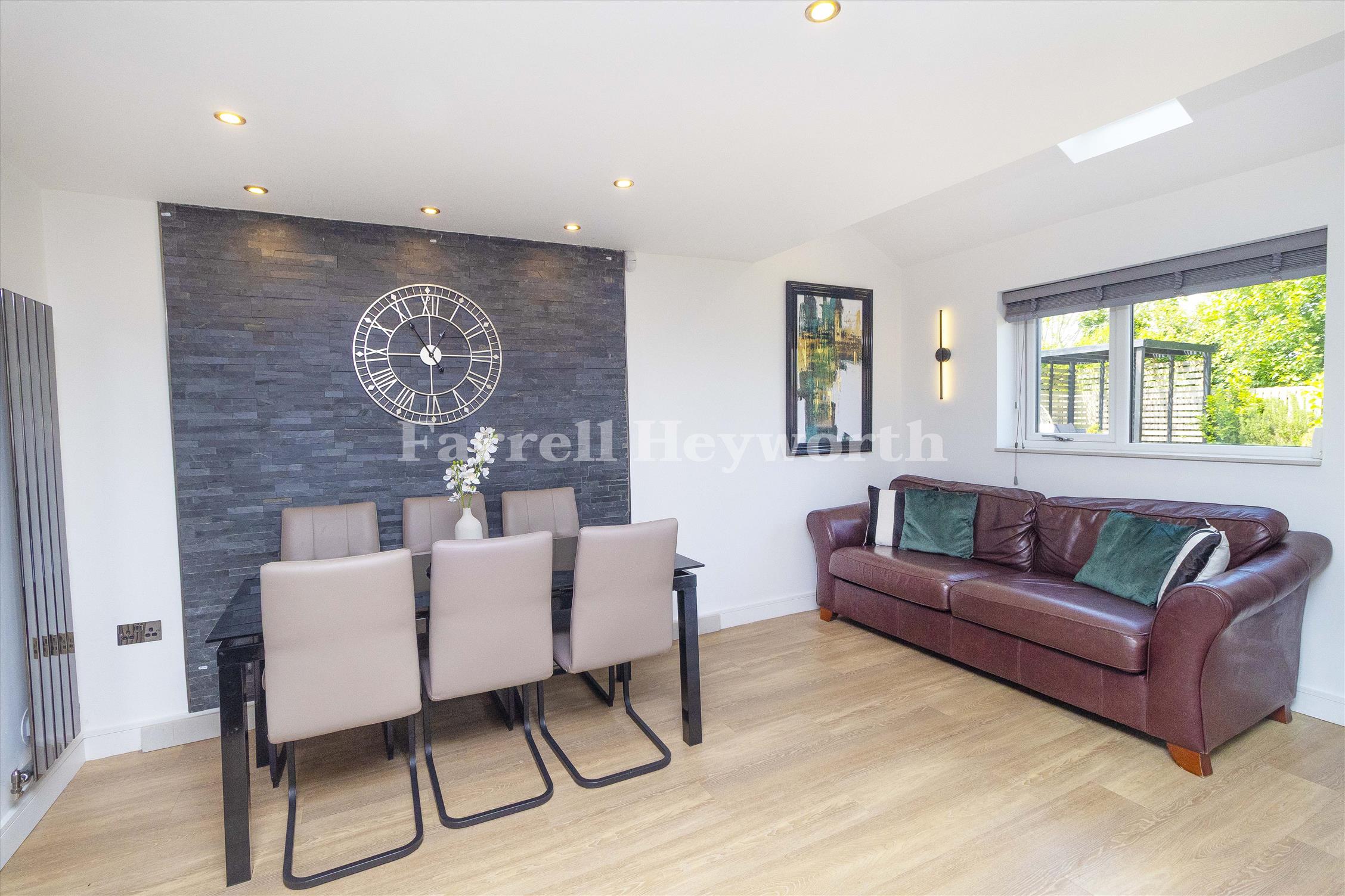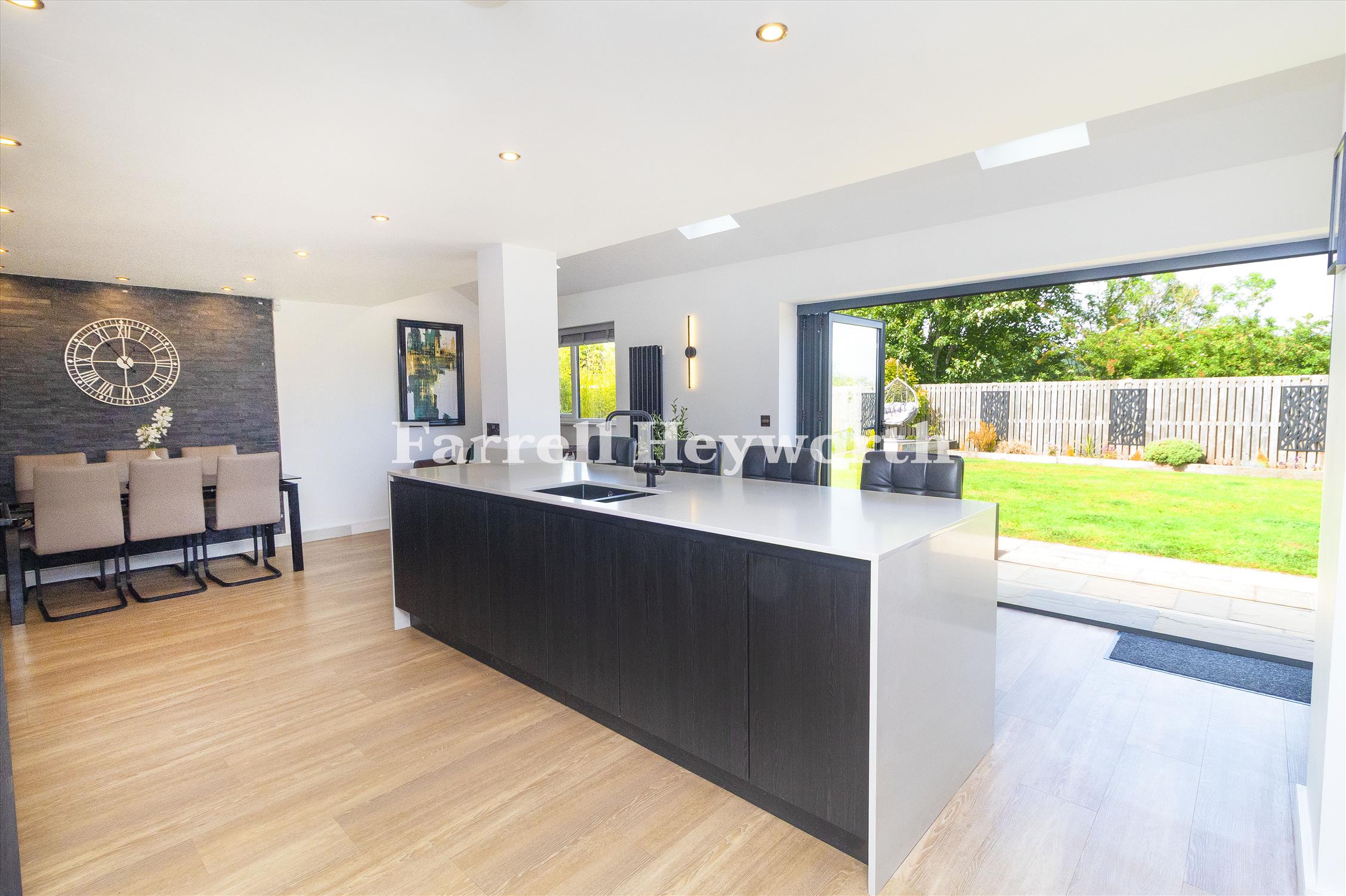 The heart of the home is a stunning, open-plan high specification kitchen, Quartz worktops with a waterfall-edge breakfast bar, a sleek full smoked glass splashback, and premium Neff and Samsung integrated appliances, including an instant hot water tap. This stylish and functional space flows effortlessly into the main living and dining areas, enhanced by high quality flooring throughout and aluminium bifold doors that open onto the rear garden—perfect for relaxed entertaining and seamless indoor-outdoor living.