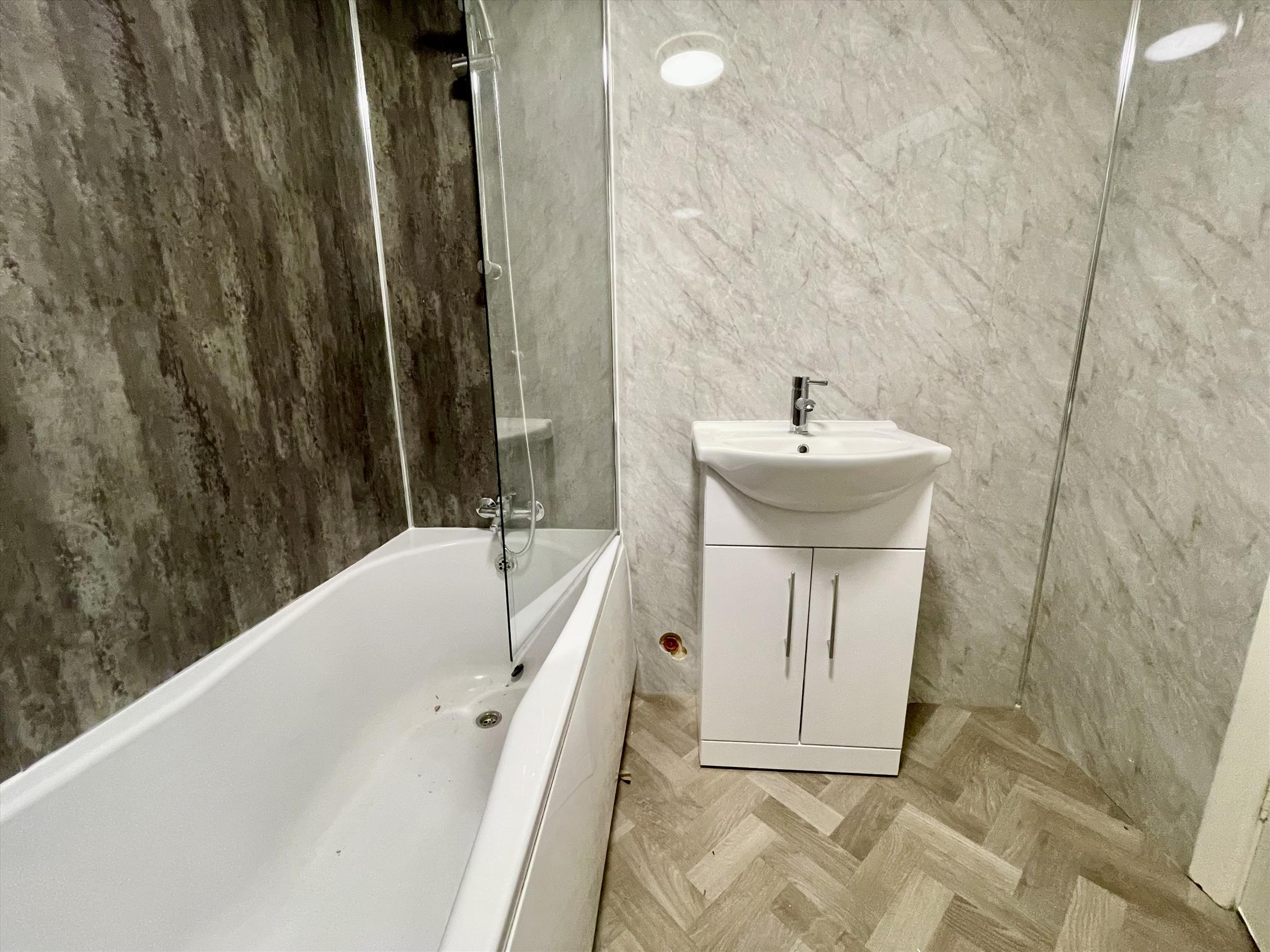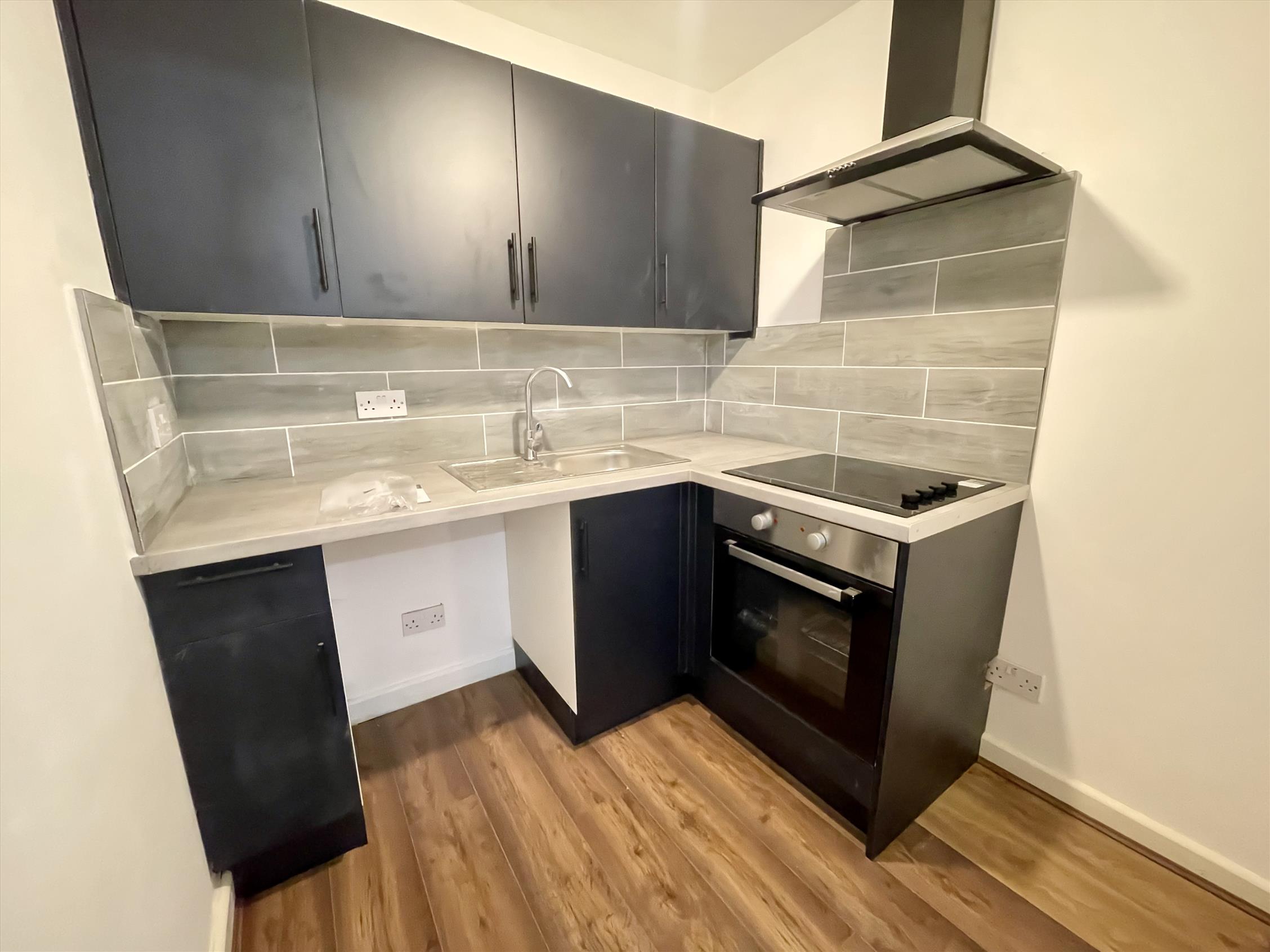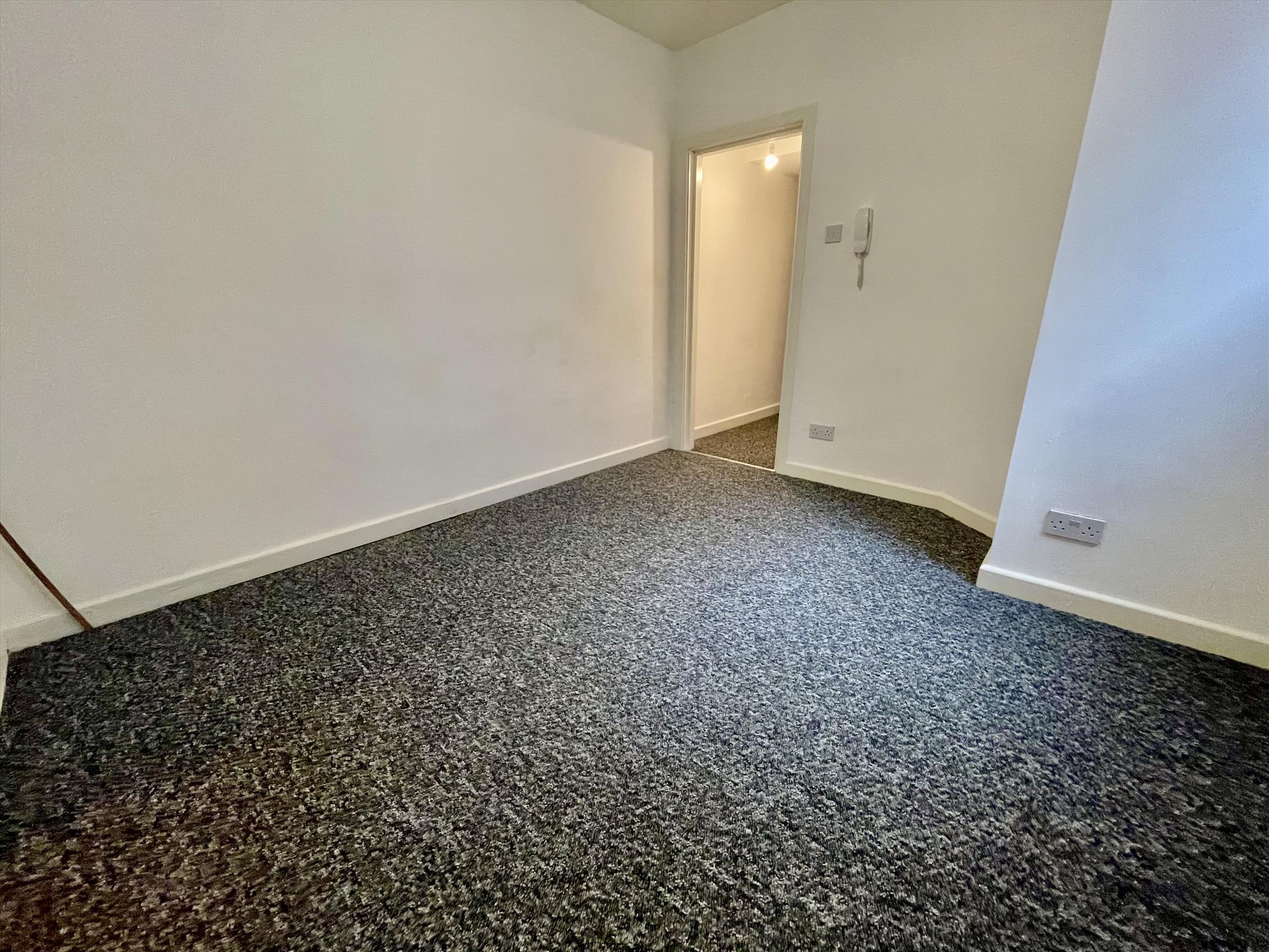 The flat has a hallway leading through to the living room/bedroom, with a separate space for the kitchen through an archway, which is fit with Midnight Blue carcasses and brand new appliances. Towards the rear of the flat is another hallway which follows through to the three-piece suite bathroom with additional showerhead over the bath. There is also private access to the rear communal yard from this flat.