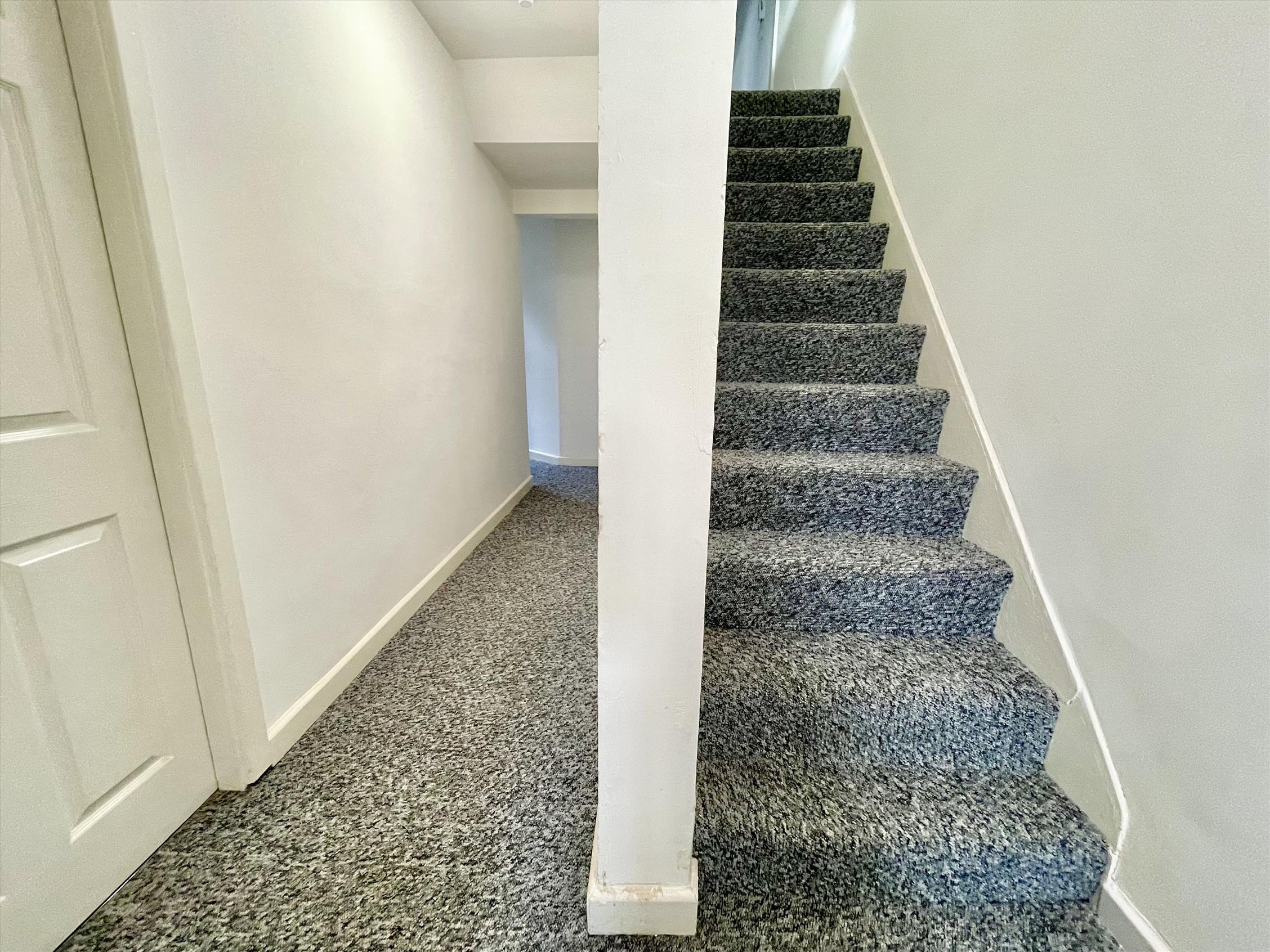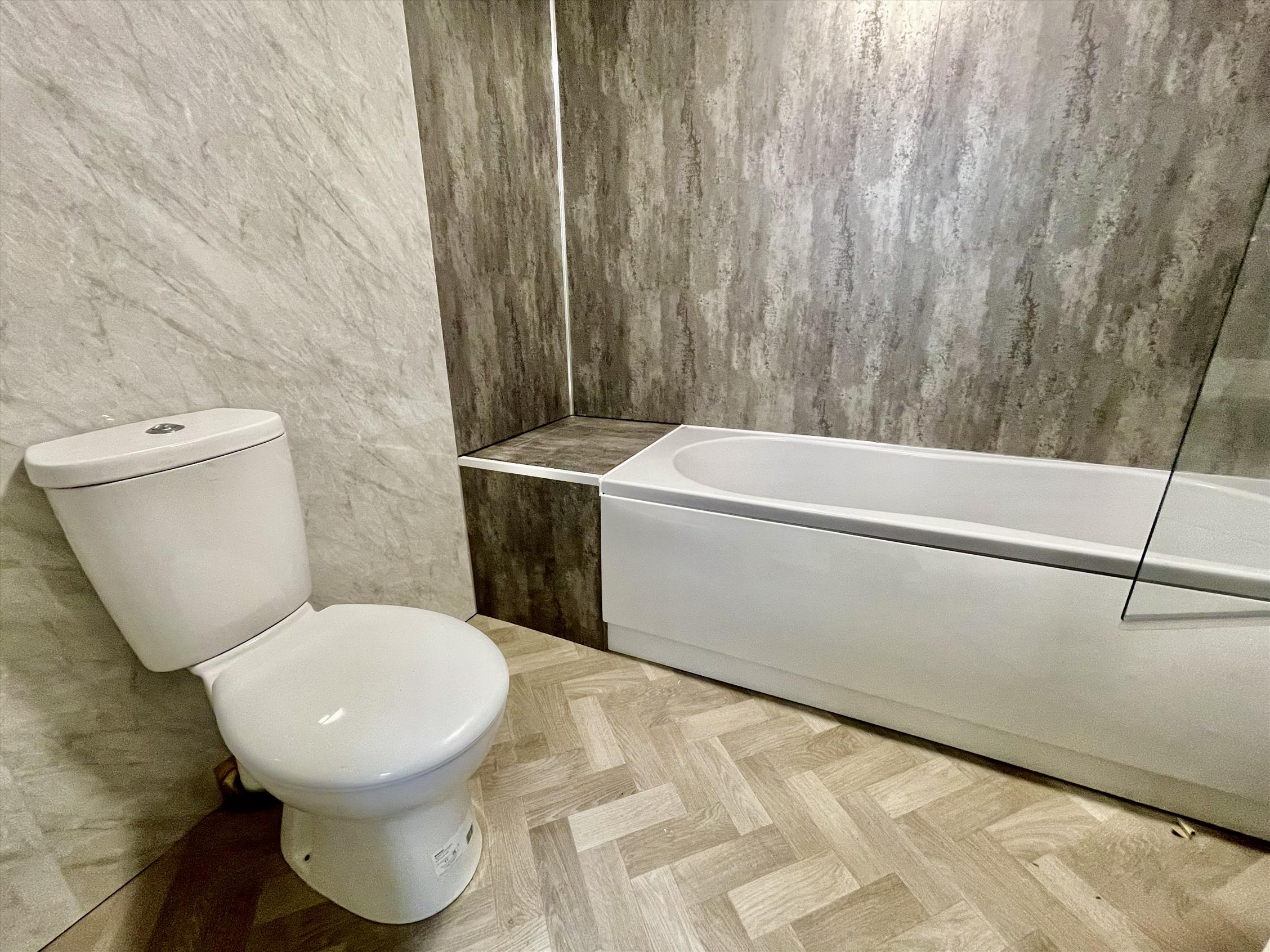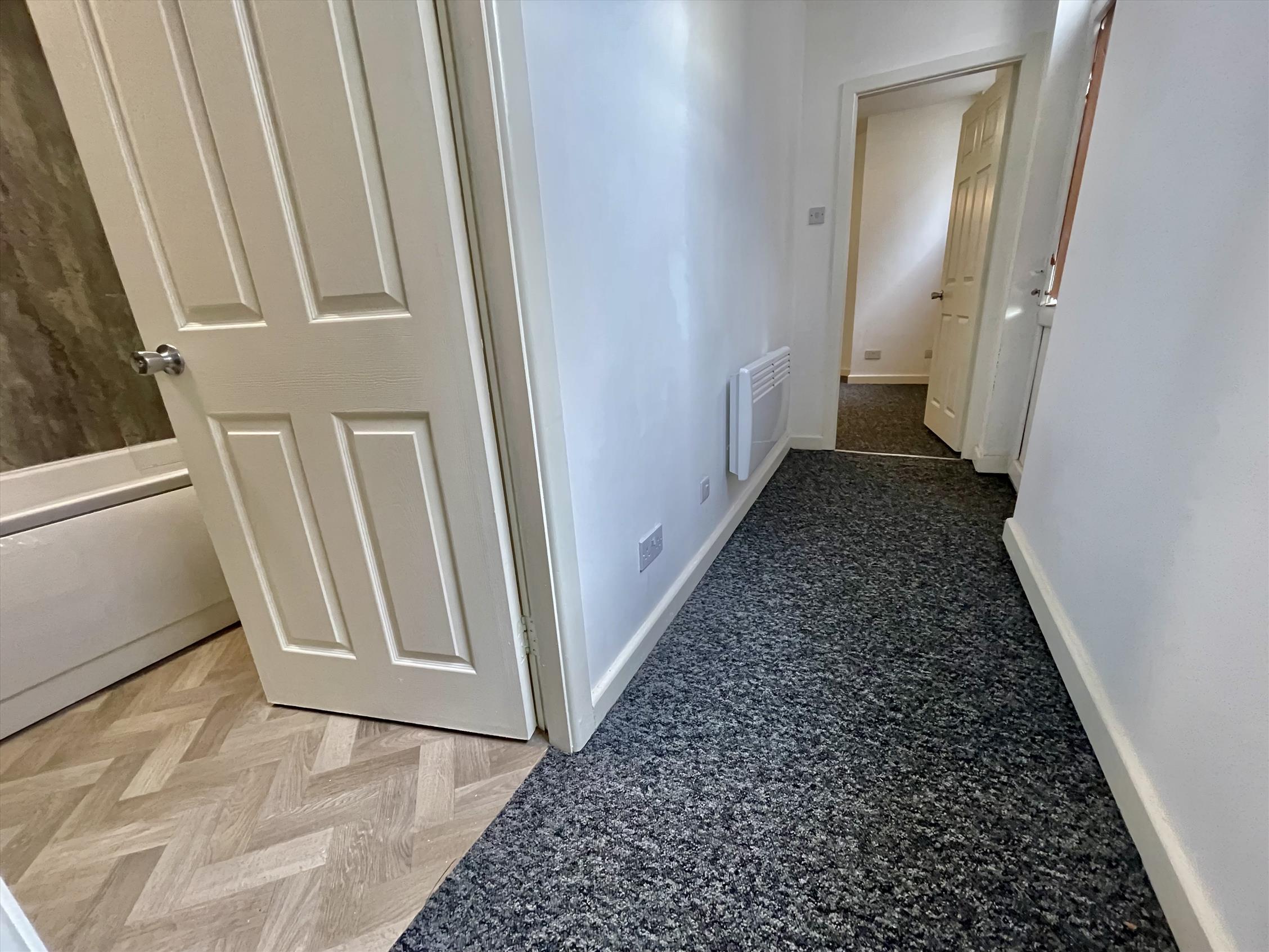 The flat has a hallway leading through to the living room/bedroom, with a separate space for the kitchen through an archway, which is fit with Midnight Blue carcasses and brand new appliances. Towards the rear of the flat is another hallway which follows through to the three-piece suite bathroom with additional showerhead over the bath. There is also private access to the rear communal yard from this flat.