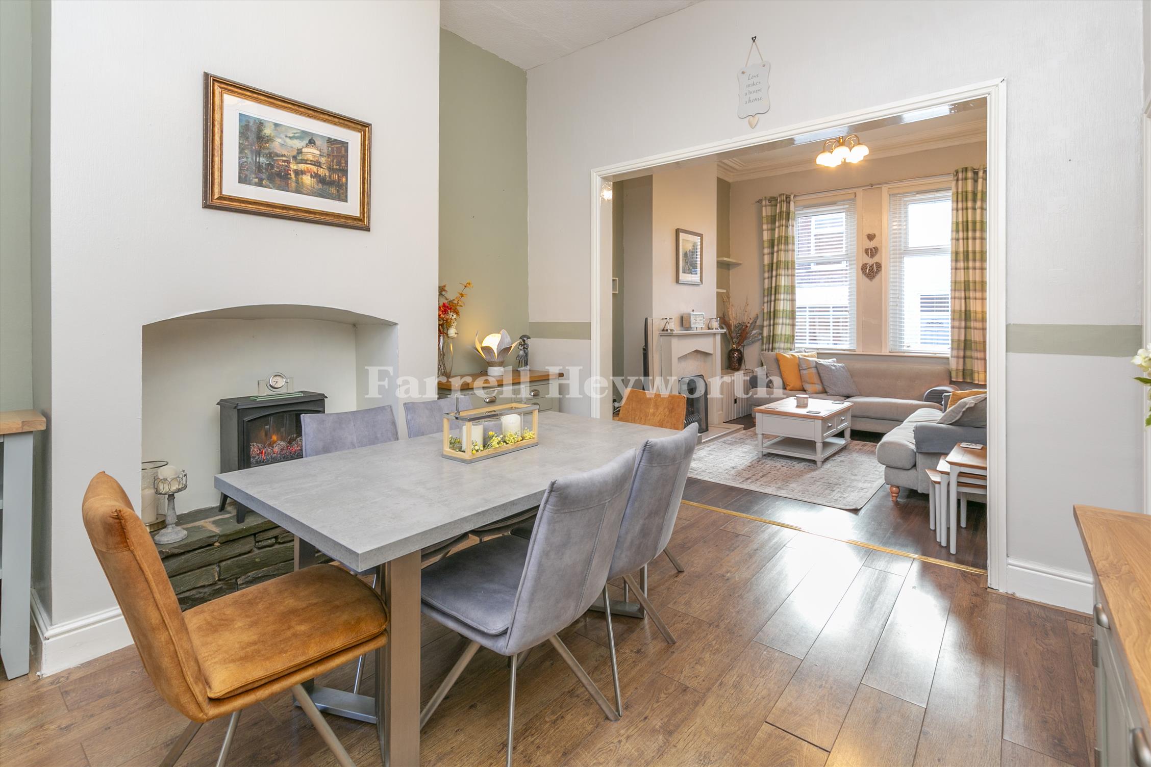 The accommodation includes a reception room, dining area with an open plan layout and a fitted kitchen. To the first floor there are two bedrooms and a family bathroom with a separate shower.