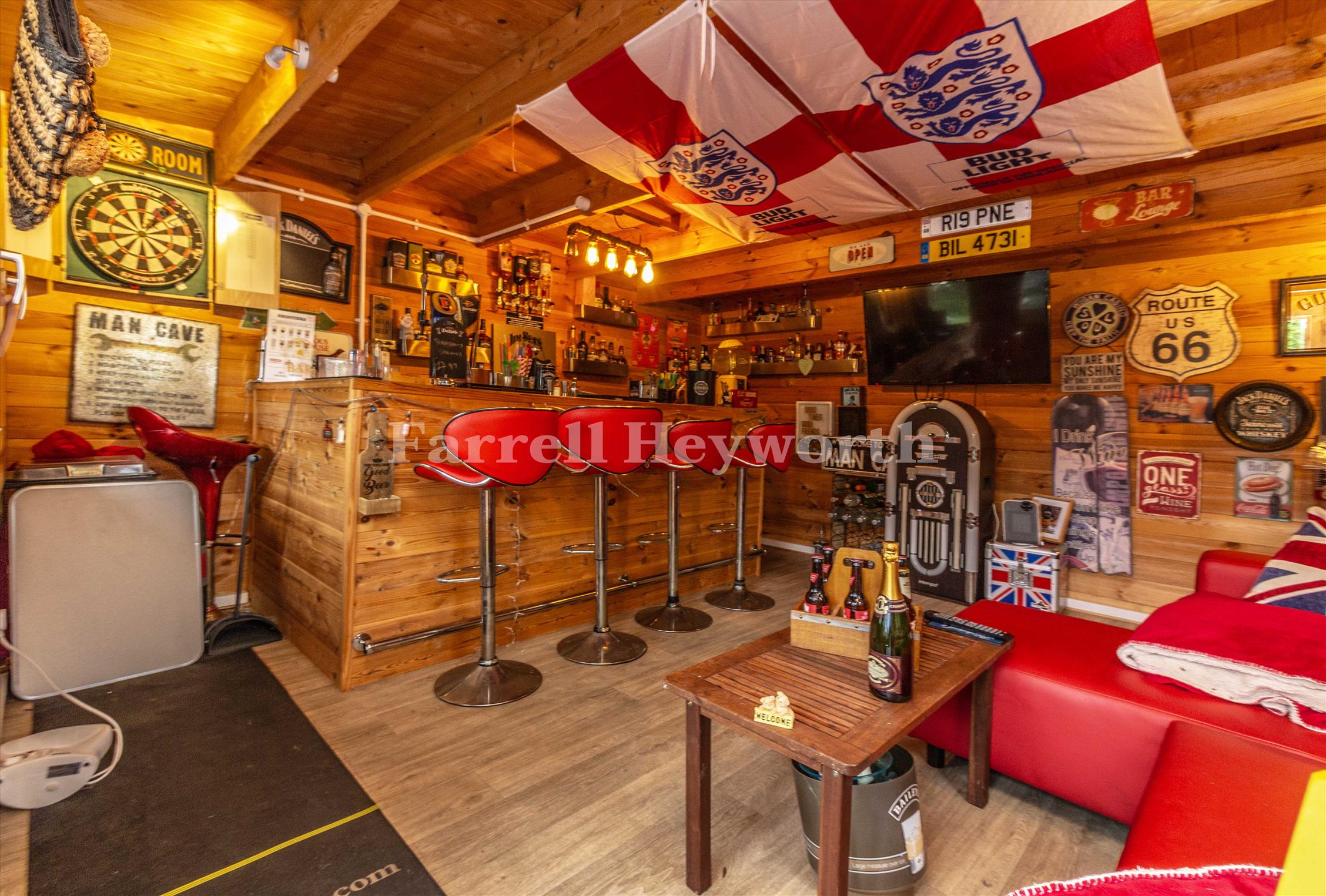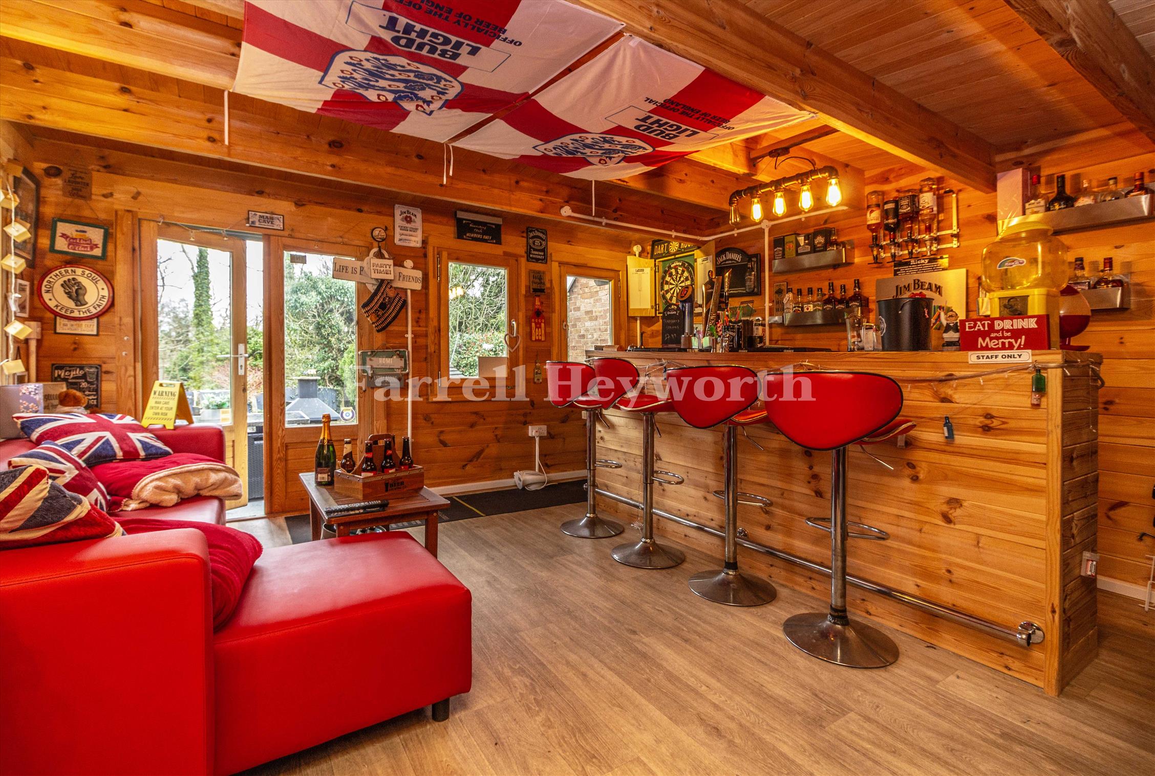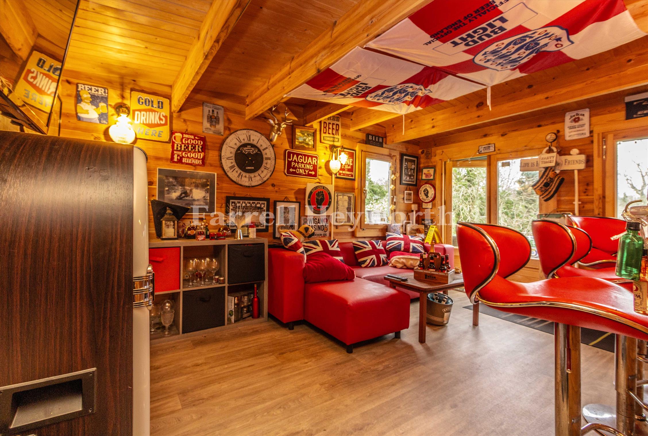 Impressive summerhouse/log cabin, currently used as a stylish bar but suitable for a variety of uses such as a home office, gym, or studio