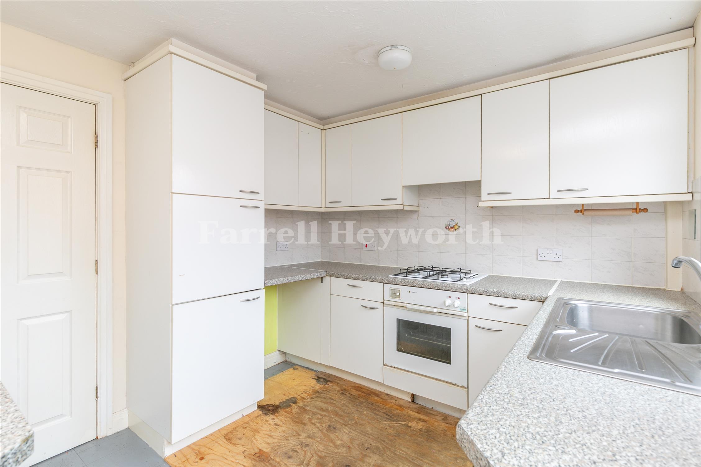 The property requires renovation throughout and offers a reception room and a kitchen with a breakfast bar, featuring French doors that open onto the rear garden.