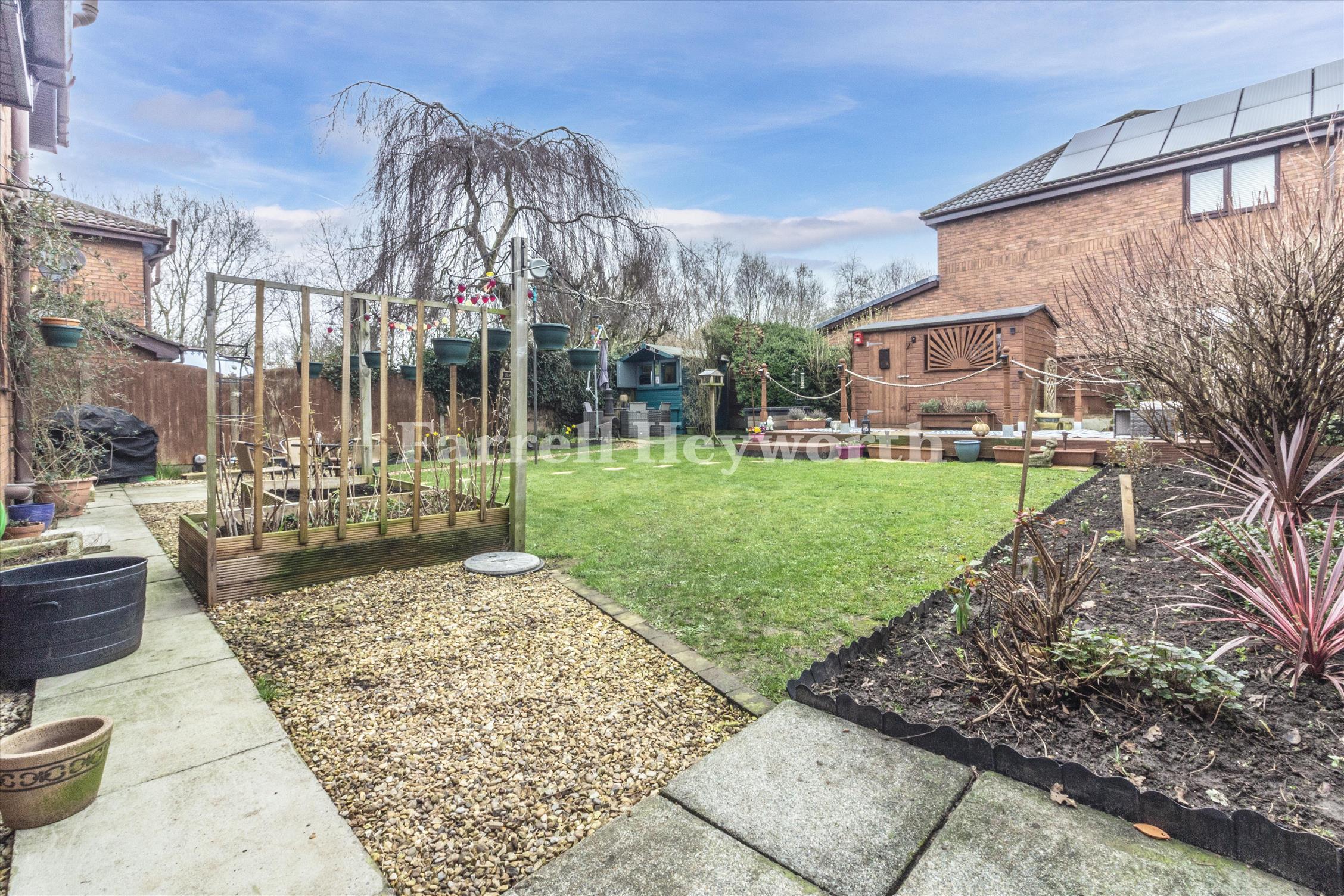 The rear garden is a standout feature of this home. Thoughtfully designed for relaxation and socialising, it includes a raised decking area, perfect for outdoor dining, along with a stylish garden bar—ideal for summer gatherings and weekend entertaining. The space is private, low-maintenance and beautifully presented. A double garage provides excellent storage or workshop potential, while the driveway offers additional off-road parking.