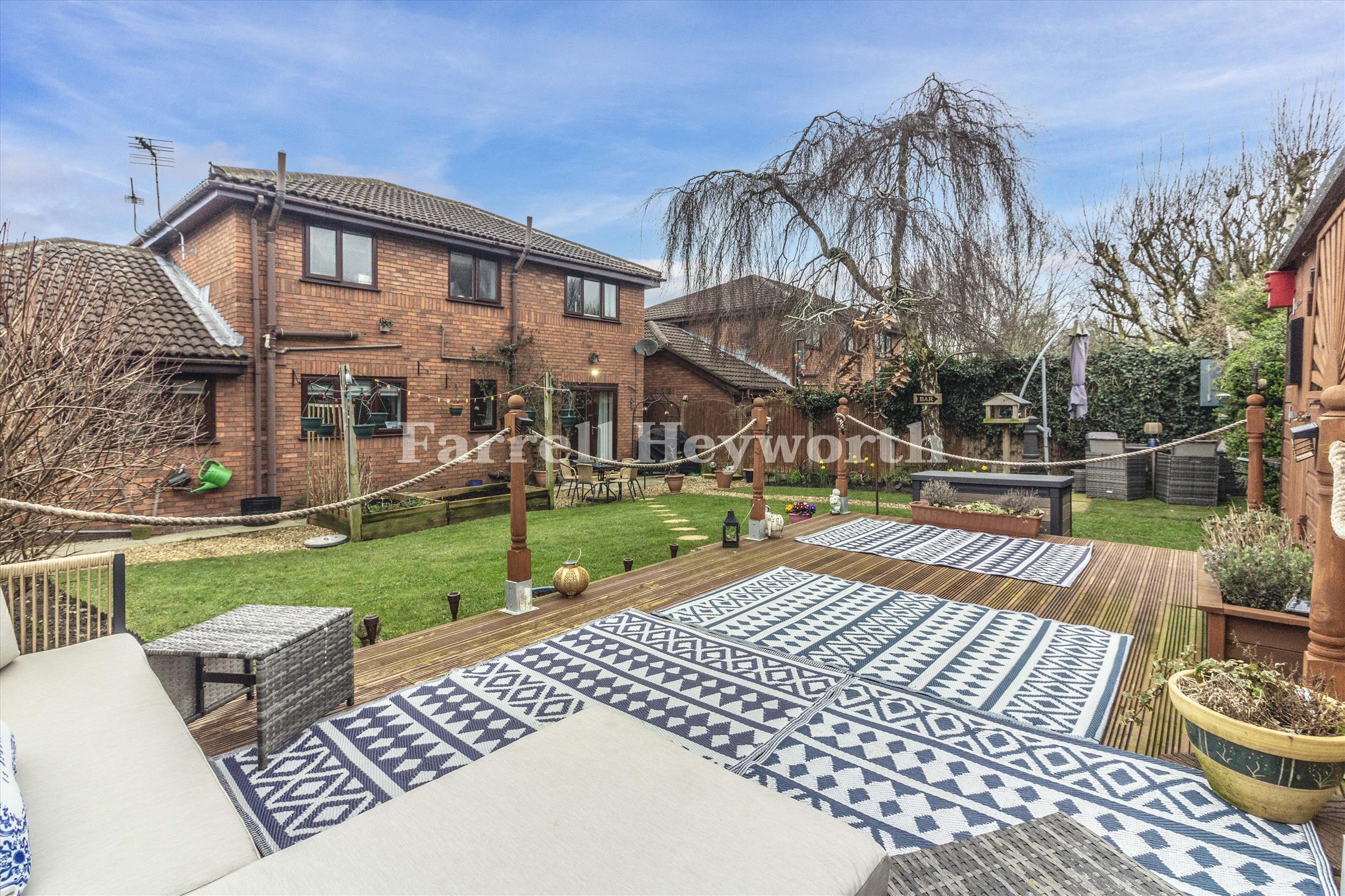 With a double garage and a beautifully landscaped outdoor space complete with raised decking and a bespoke garden bar, this property is ideal for families and those who love to host.