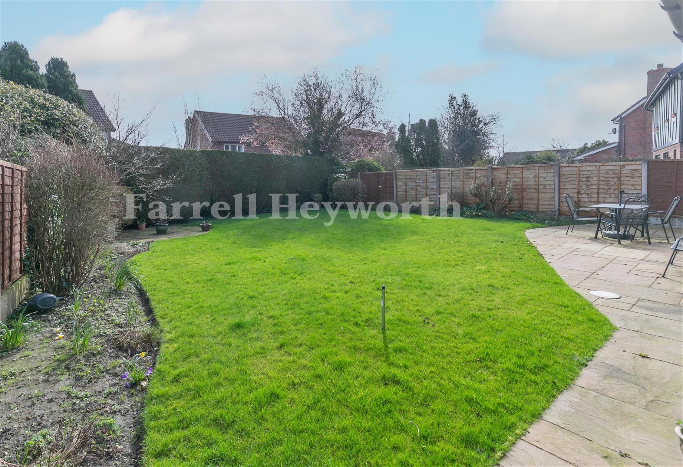 Externally, the property boasts a sizeable rear garden with a patio area, a front garden, and an attached double garage with electric door, and a driveway for multiple vehicles.