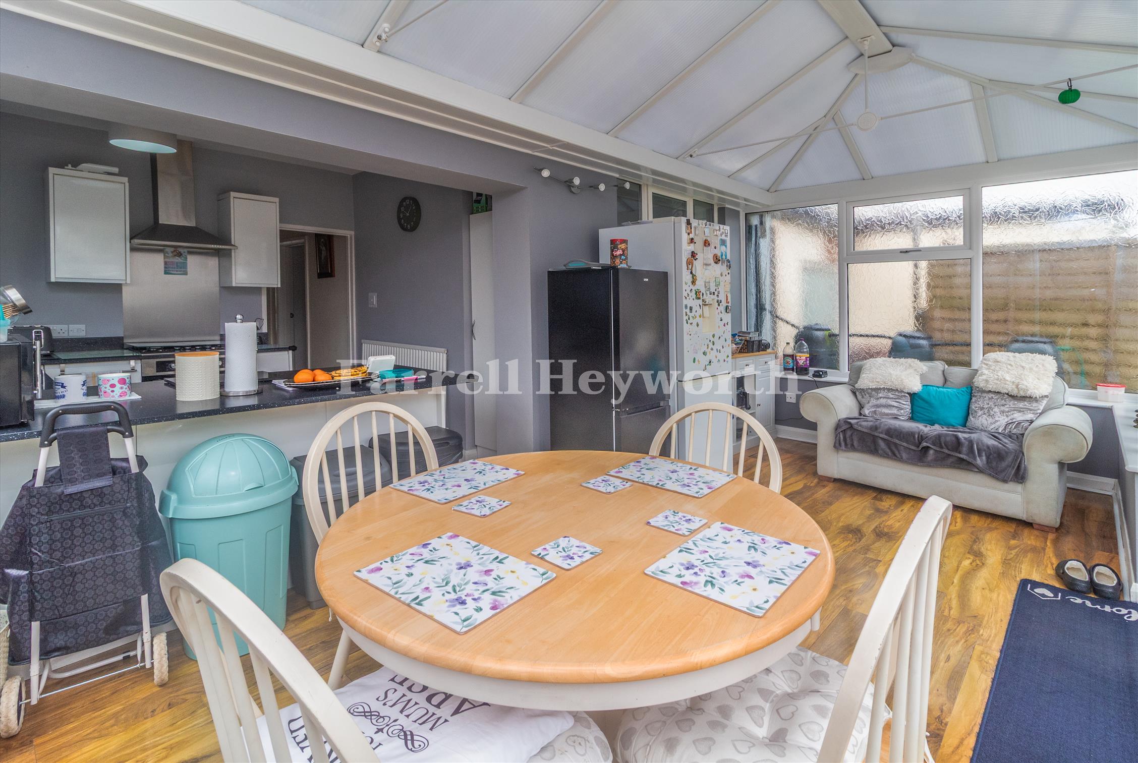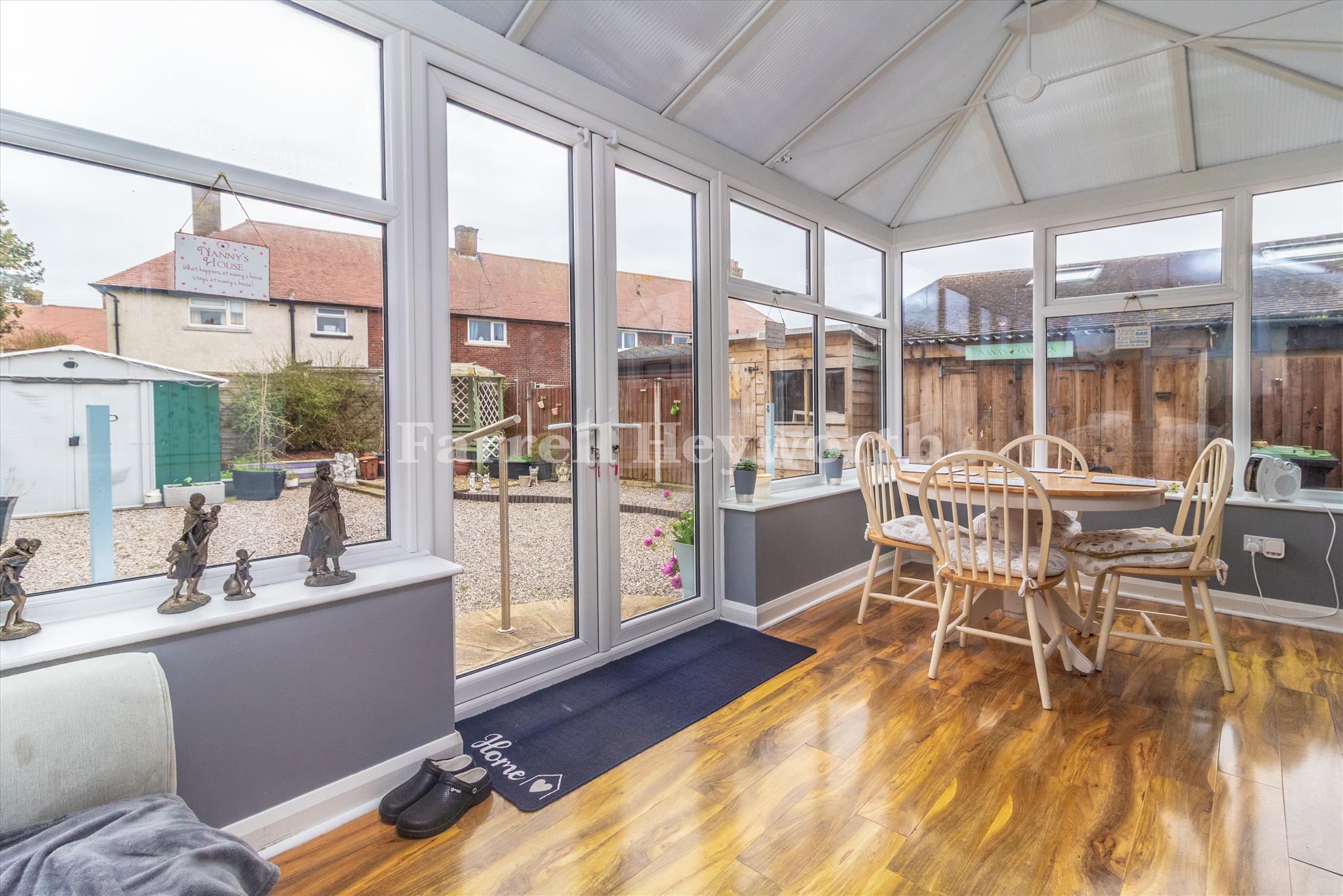The ground floor features an entrance hallway, a well-presented lounge, a modern bathroom, two bedrooms, and a contemporary fitted kitchen that opens into a bright conservatory/dining area, perfect for everyday living and entertaining.