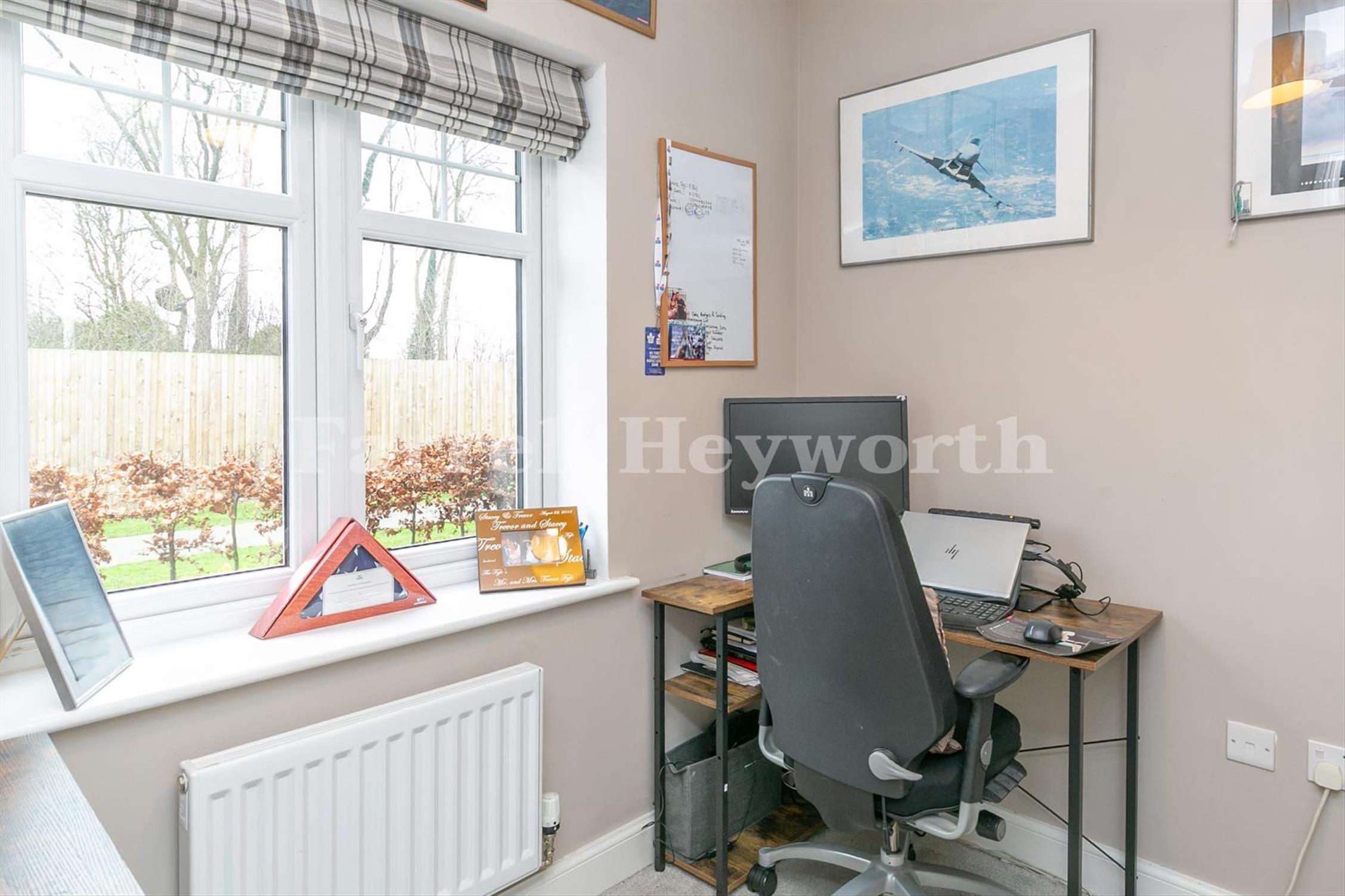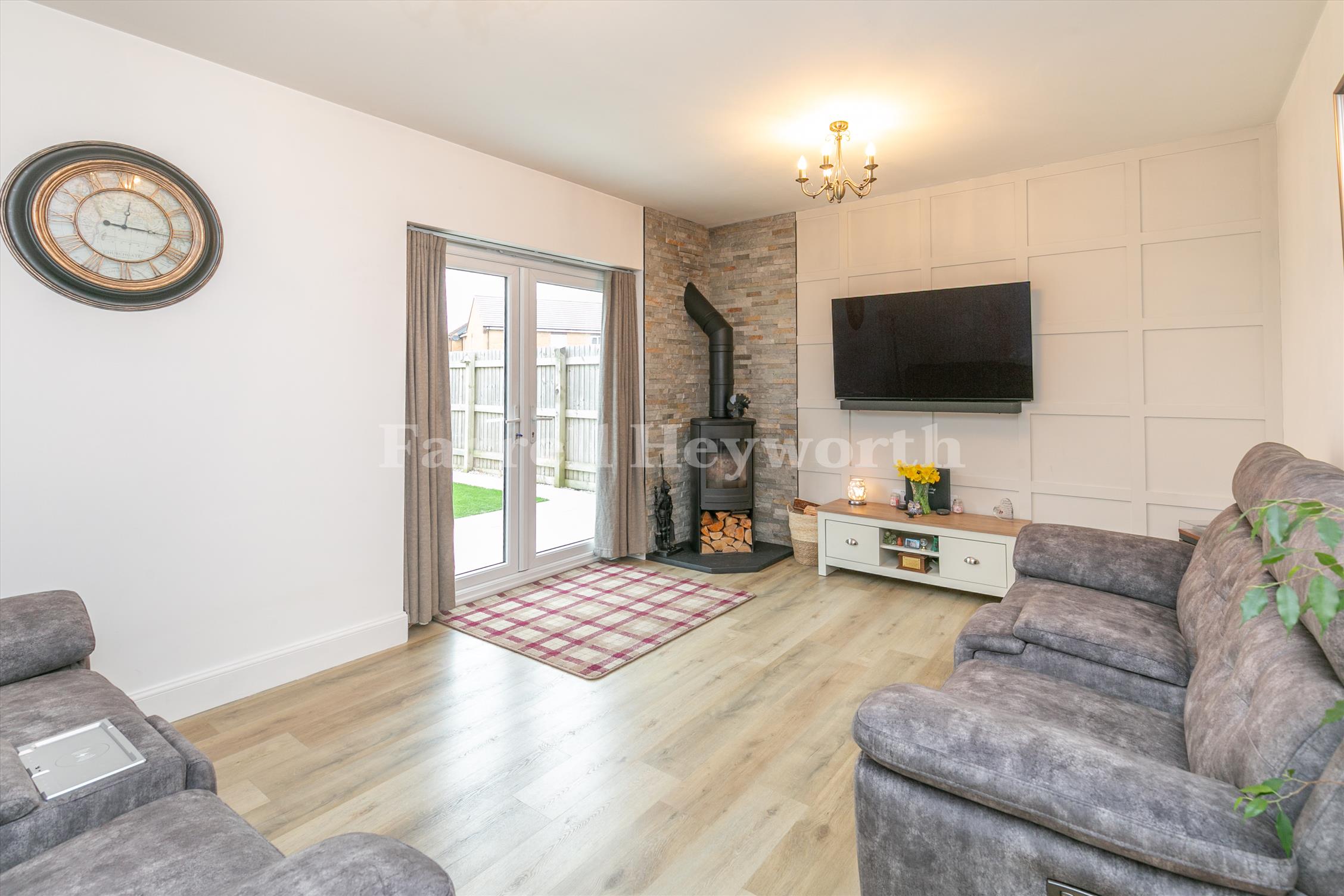 The welcoming reception room features a log burner and double doors opening onto the rear garden, alongside a sizeable kitchen diner and a dedicated office space.