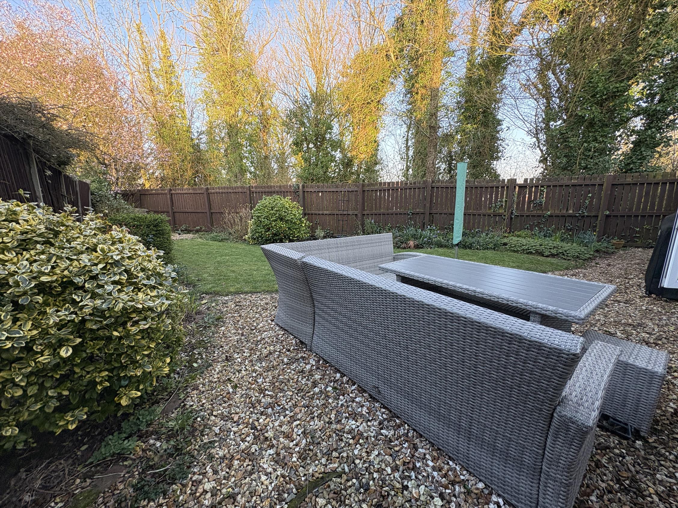 The garden offers a private rear garden and a detached garage. There is also a driveway for multiple cars.