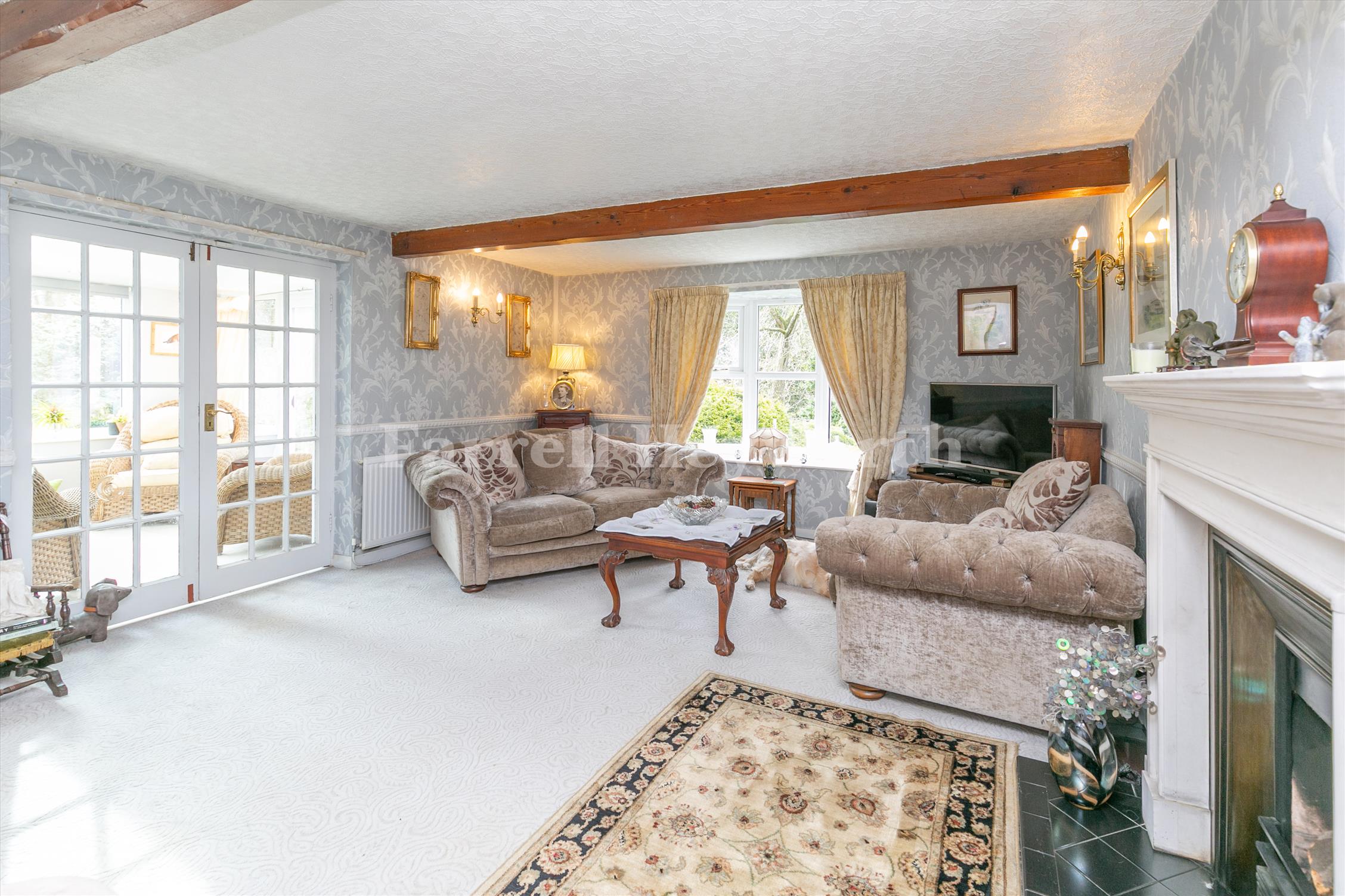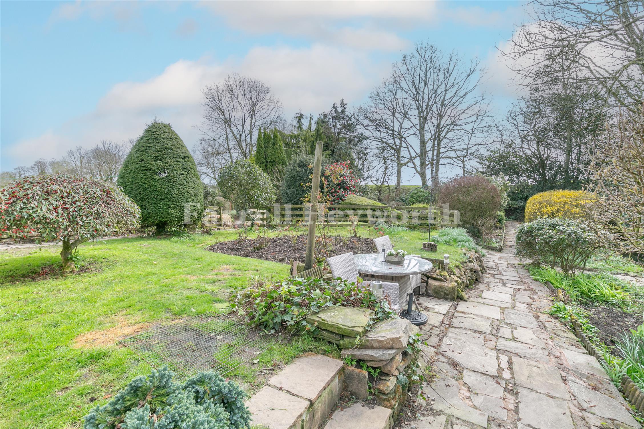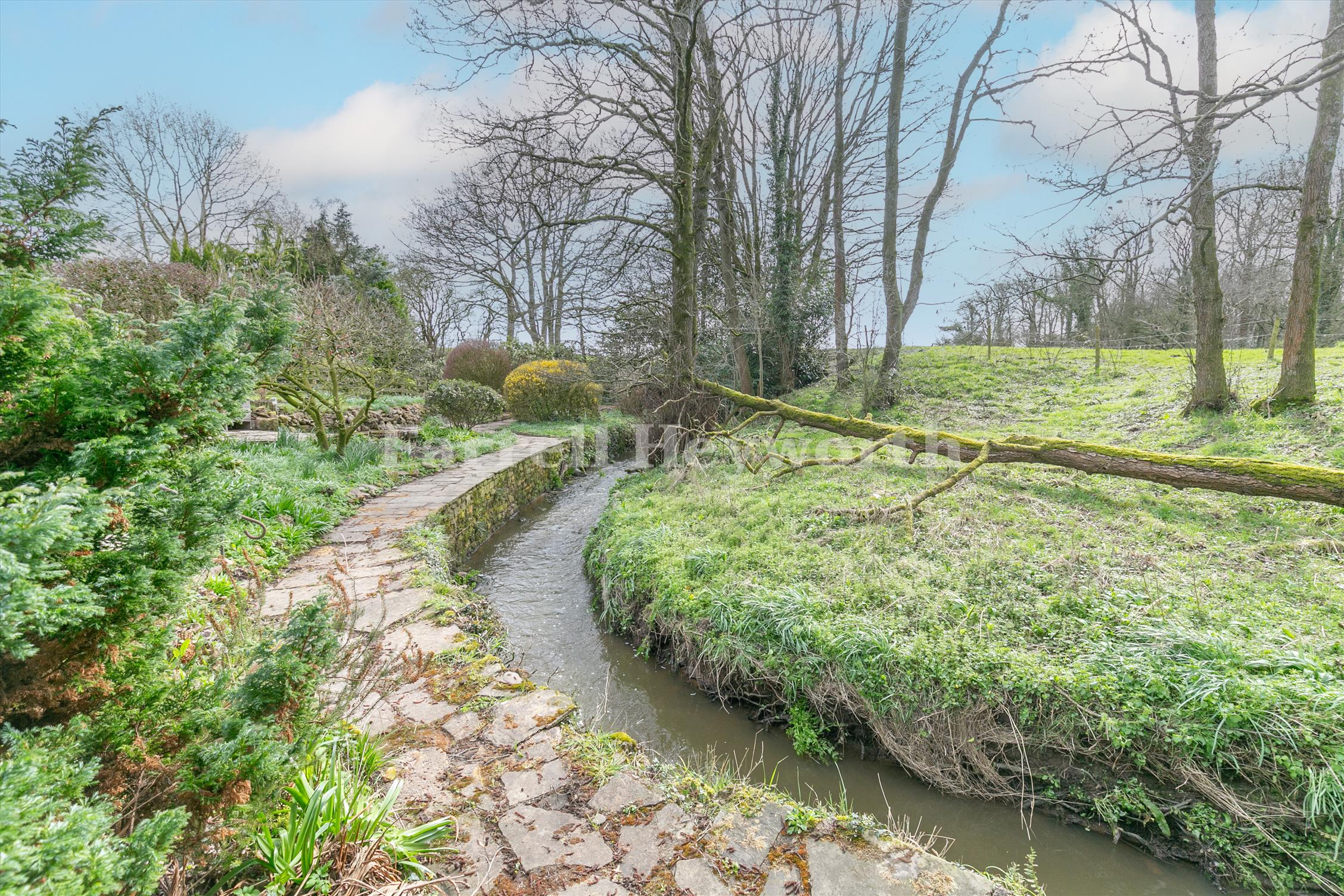 Outside, the home sits on an impressive plot featuring beautifully landscaped gardens, its own tranquil stream, and a generous patio perfect for outdoor living. A private driveway with space for multiple vehicles and a garage further enhance the appeal of this unique property.