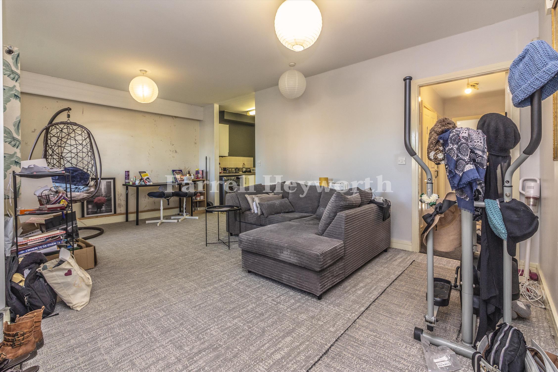 The apartment opens into a spacious living area, providing ample room for both relaxation and dining. This flows effortlessly into the open-plan kitchen, creating a sociable and inviting space. A central hallway leads to a three-piece bathroom, along with two well-proportioned bedrooms. The master bedroom benefits from its own private en suite shower room, while the second bedroom offers flexibility as a guest room, home office, or nursery.