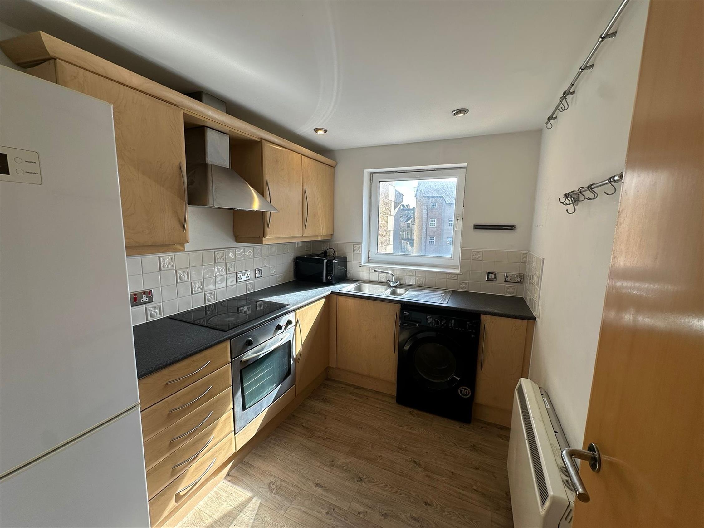 A separate kitchen with a good range of units finished in light beech with stainless steel trim. Inset electric halogen hob, oven and extractor fan, integral washer dryer and Free standing fridge freezer.