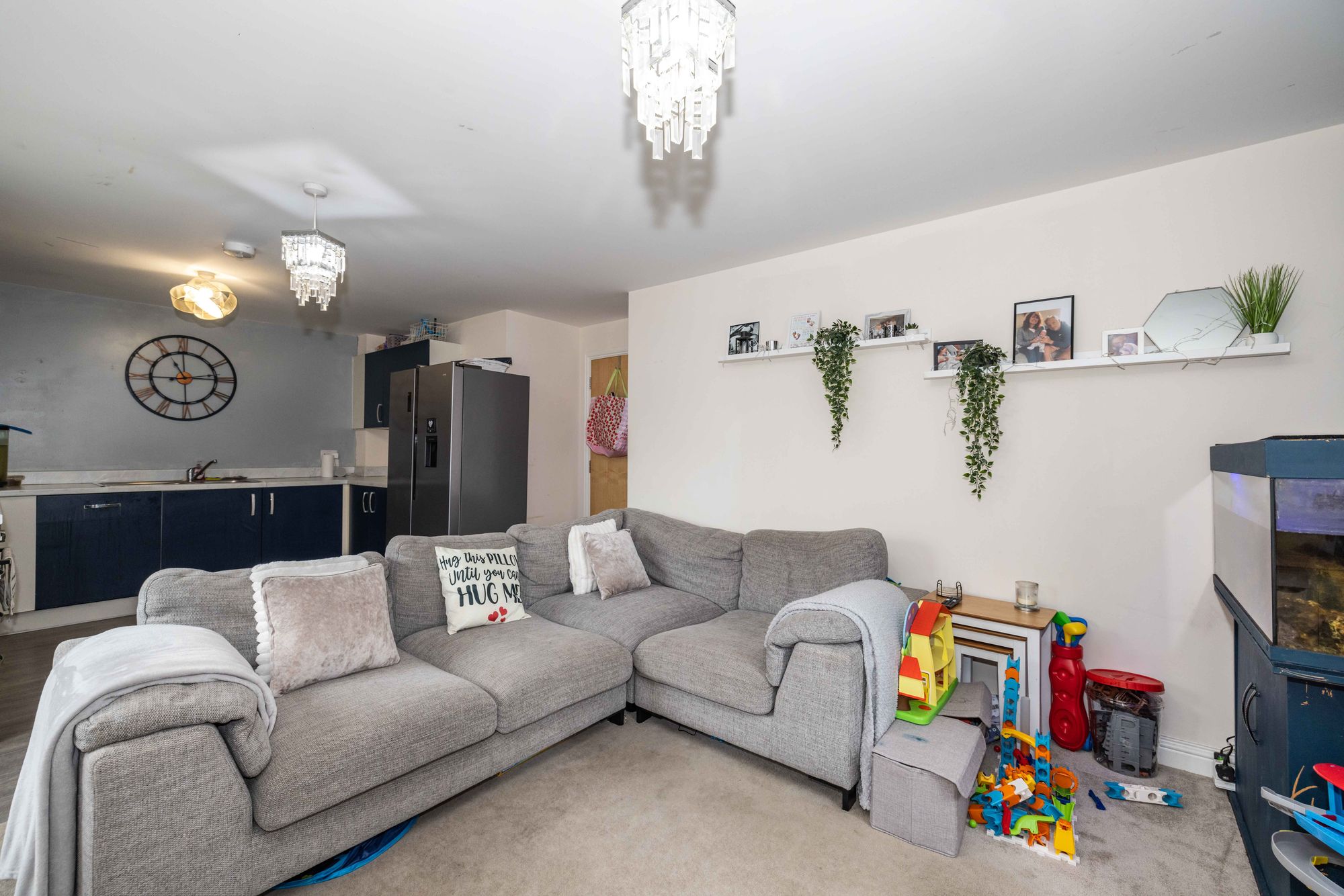 Upon entering, one is greeted by an inviting open-plan living space that seamlessly integrates the lounge, dining area, and kitchen. The contemporary design is enhanced by large windows that flood the room with natural light, creating a bright and airy ambience throughout. The neutral colour palette complements various decor styles, providing a versatile canvas for personal touches.