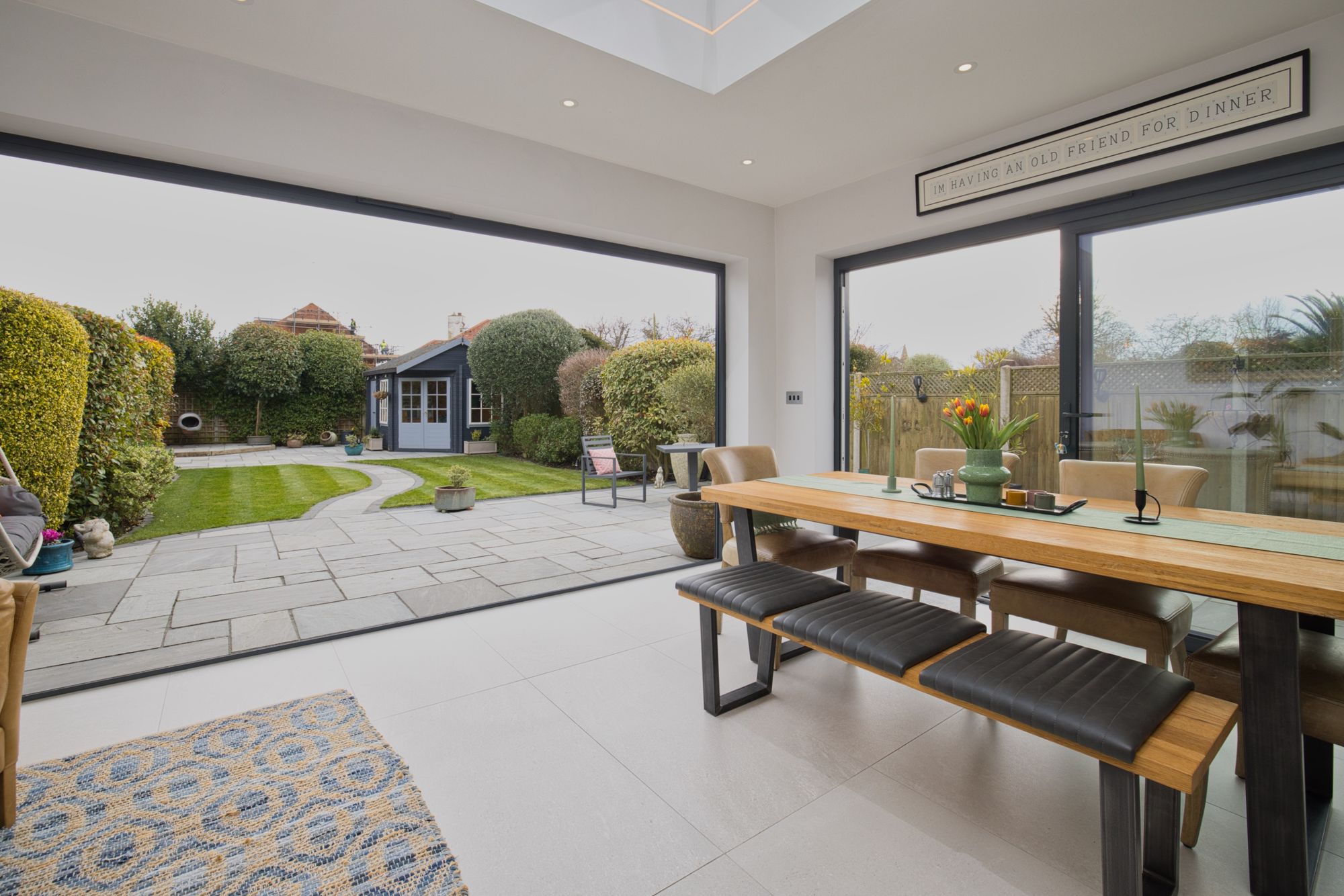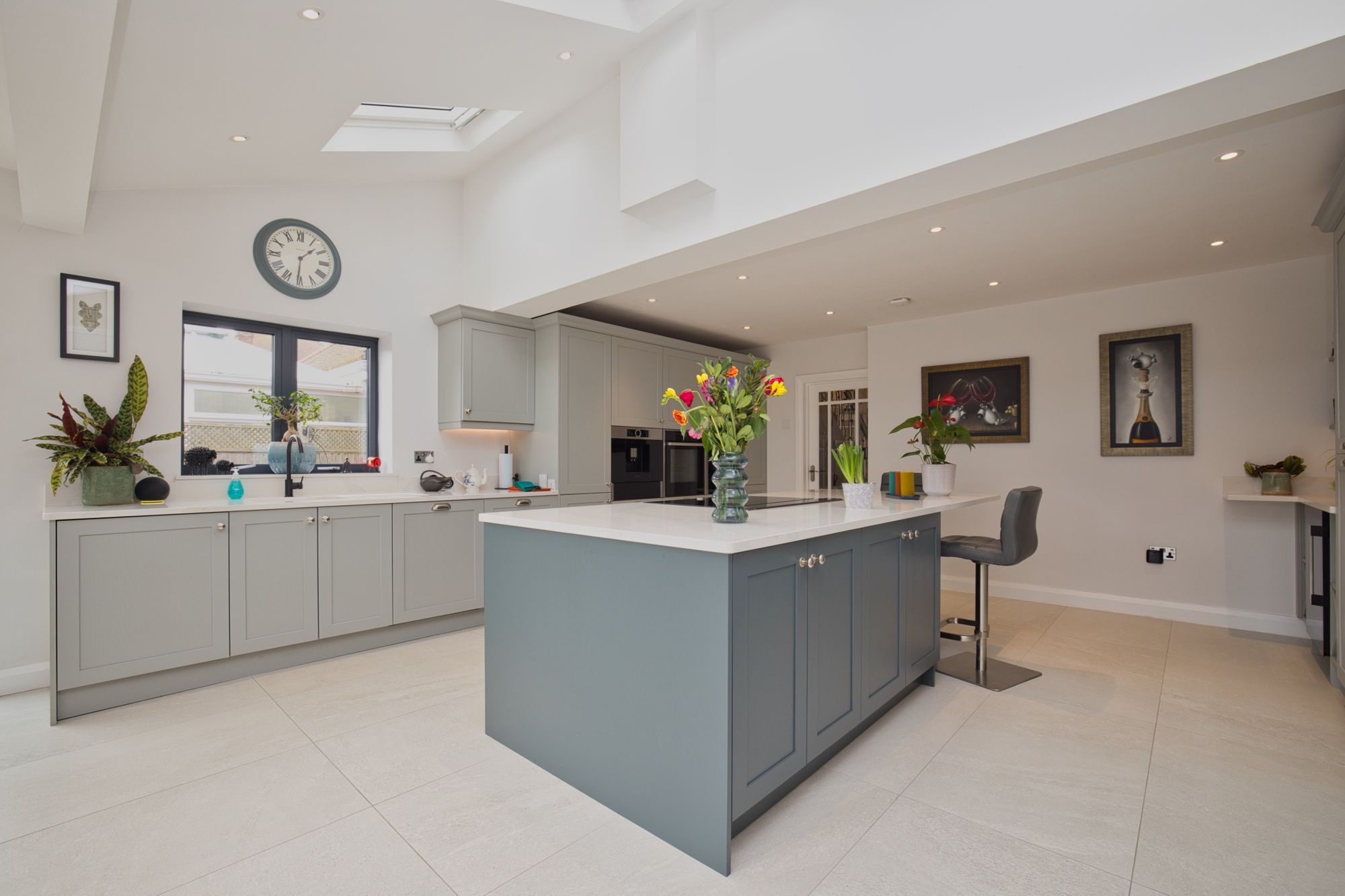 The rear of the property has been remodelled and extended to create a stylish open-plan Smallbone kitchen/diner and lounge area with bifolding doors and a further large sliding door to the paved garden. The kitchen boasts underfloor heating, a range of high-spec integrated appliances including wine cooler, double fridge & freezer, induction hob and hidden extractor fan. The beautiful kitchen island is ideal for entertaining with a roof lantern maximising natural light, electric censored velux windows, and a Lutron lighting system giving ultimate control.