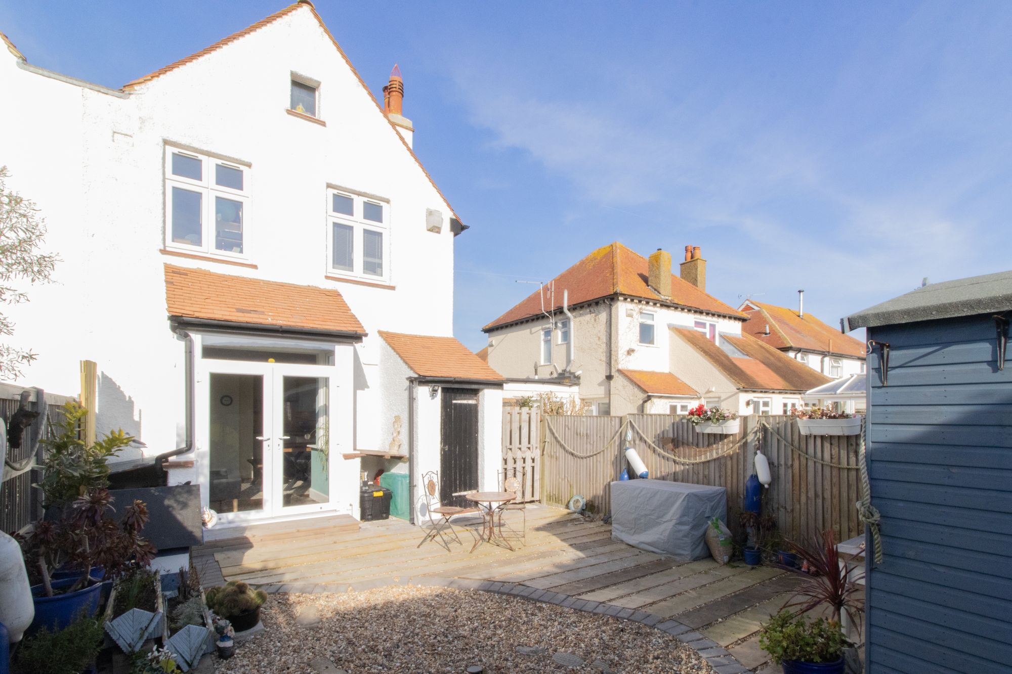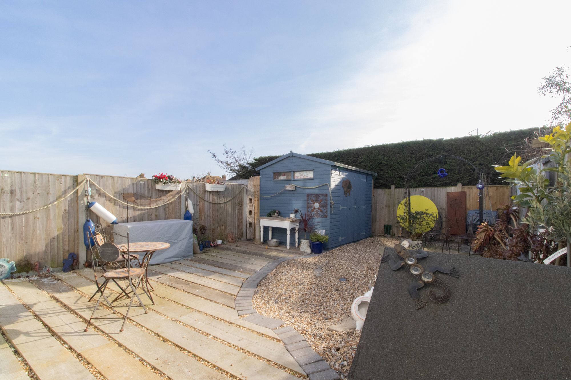 One of the highlights of this property is the south-facing low maintenance garden, a delightful outdoor space that bathes in natural sunlight throughout the day. This tranquil oasis provides the perfect setting for al fresco dining or simply basking in the sun, offering a peaceful escape from the hustle and bustle of every-day life. With shed with power running to it, what used to be the outside toilet which is used as dry cold storage, and side access leading to the front.